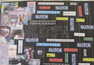 Throughout the project, students experimented with layered mixed media techniques, combining traditional materials with digital photography editing to create bold, fragmented visuals that reflect the energy and unpredictability of the glitch aesthetic.